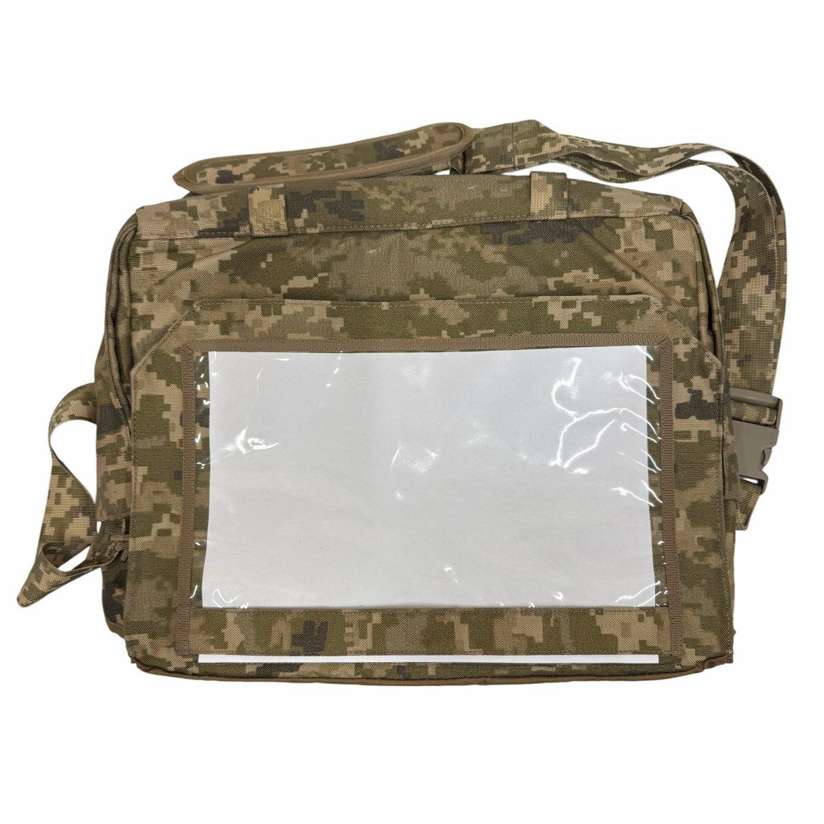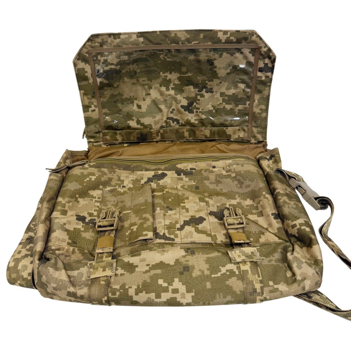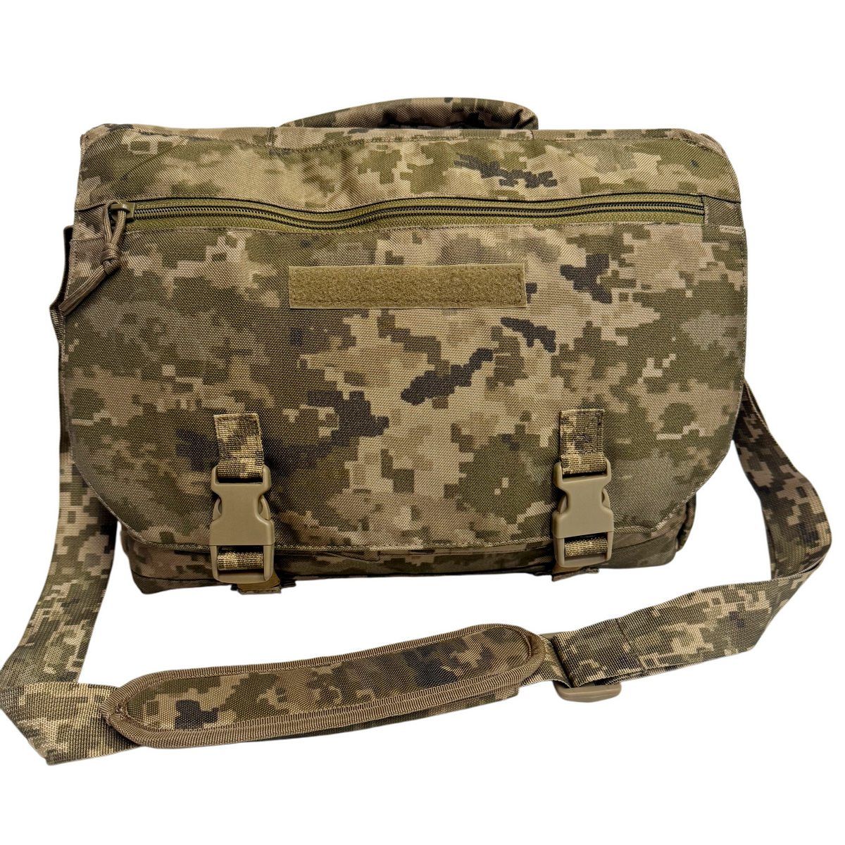 Сумка выполнена из износостойкой полиамидной ткани с камуфляжным рисунком ММ-14 («пиксель ВСУ»), с основным отделением, закрываемым крышкой-клапаном с двумя пластиковыми фиксаторами типа «фастекс». На внутренней части клапана имеется прозрачный карман для карты. Снаружи клапана находится карман, закрывающийся на застежку-молнию.