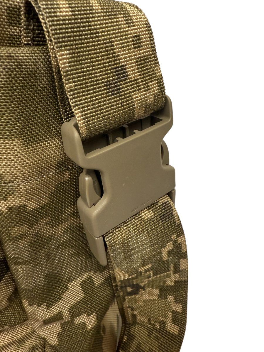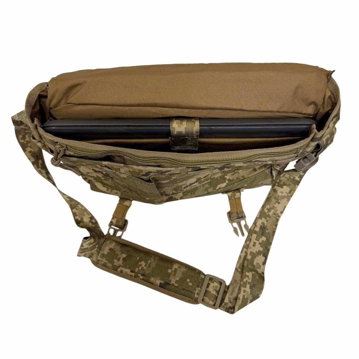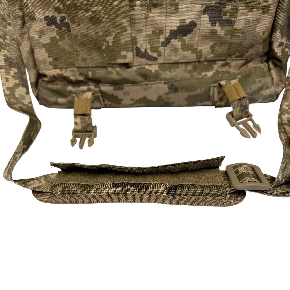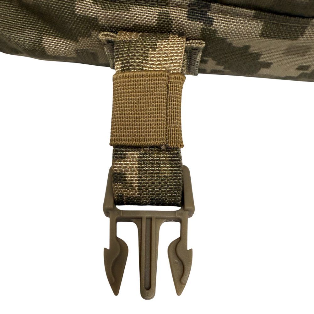 Сумка выполнена из износостойкой полиамидной ткани с камуфляжным рисунком ММ-14 («пиксель ВСУ»), с основным отделением, закрываемым крышкой-клапаном с двумя пластиковыми фиксаторами типа «фастекс». На внутренней части клапана имеется прозрачный карман для карты. Снаружи клапана находится карман, закрывающийся на застежку-молнию.