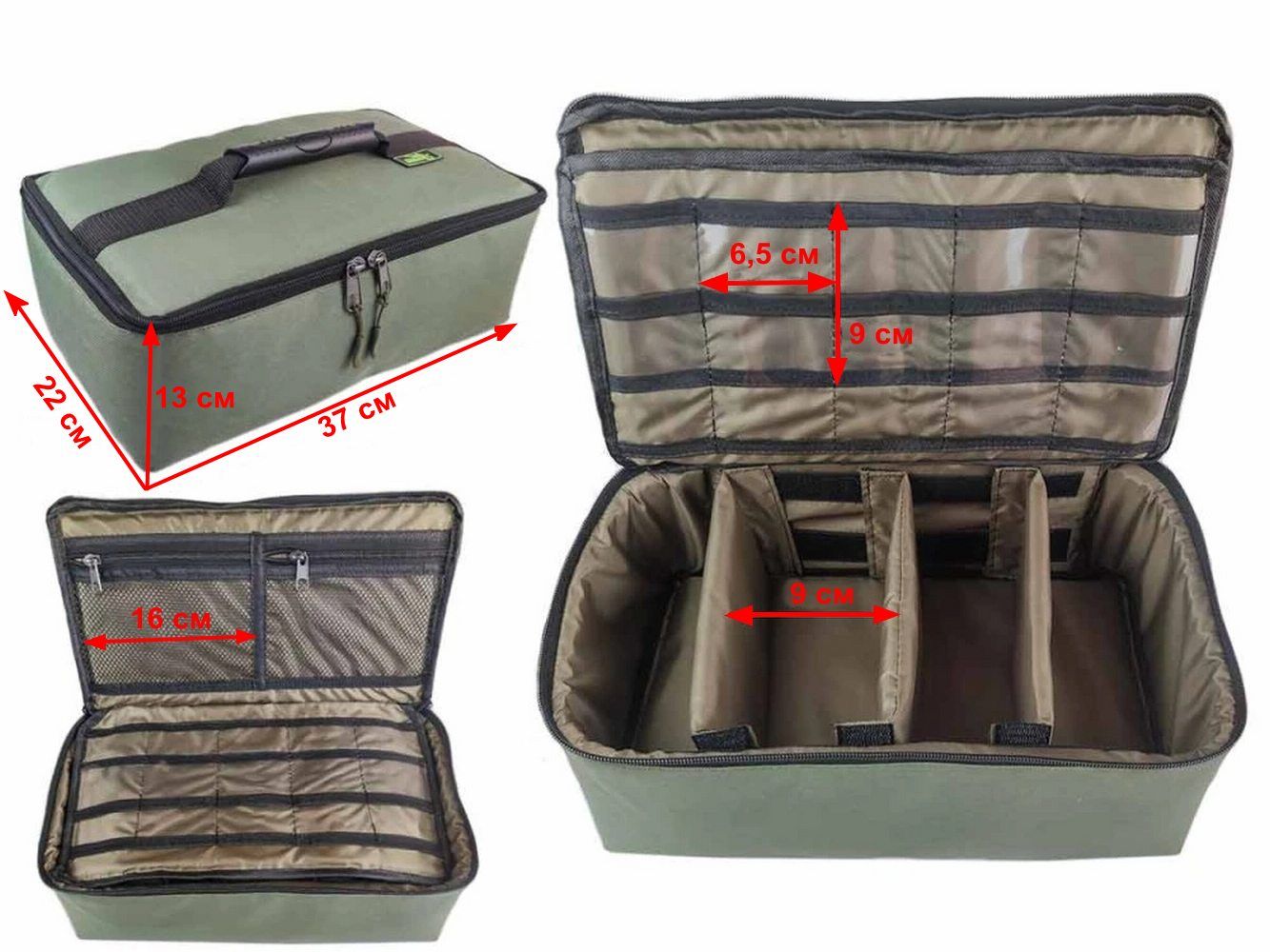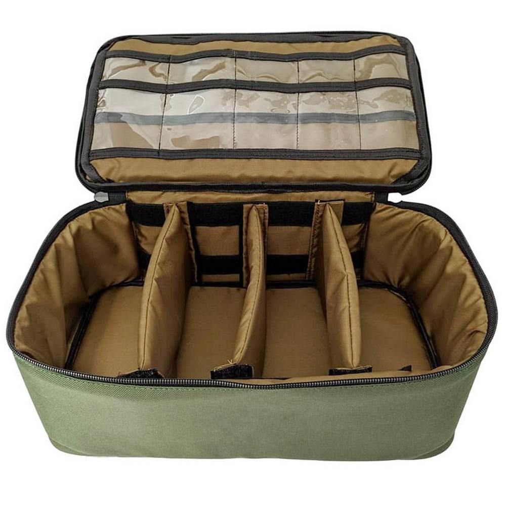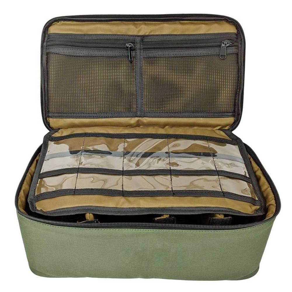 Сумка-органайзер отлично подходит для рыболовных аксессуаров. Внутри 4 регулируемых отсека, каждый отсек имеет жесткую вставку и надежно закреплен в 2 точках крепления. Есть двухсторонняя вставка-планшет с кармашками шириной 6,5 см. На крышке сумки с внутренней стороны находятся два кармана шириной 16 см на змейках.
