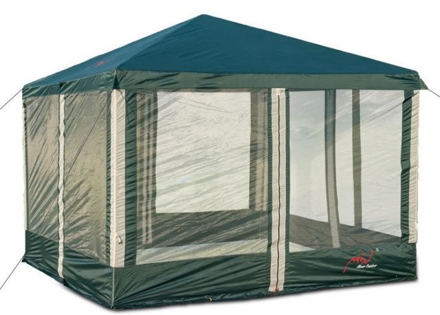 У данной модели тента по бокам москитные сетки, которые защищают от назойливых вредителей. Закрываются на молнии с 4 сторон. При необходимости неиспользуемые боковые стенки можно закрепить сверху.
