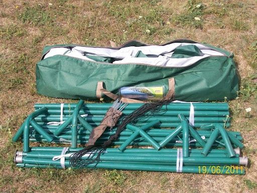 Каркас сделан из элементов металла и соединительных кронштейнов. Закрепляется на землю за счет растяжек. Сверху на тенте есть петли для натяжения веревки и колышков. Все элементы для установки идут в комплекте.