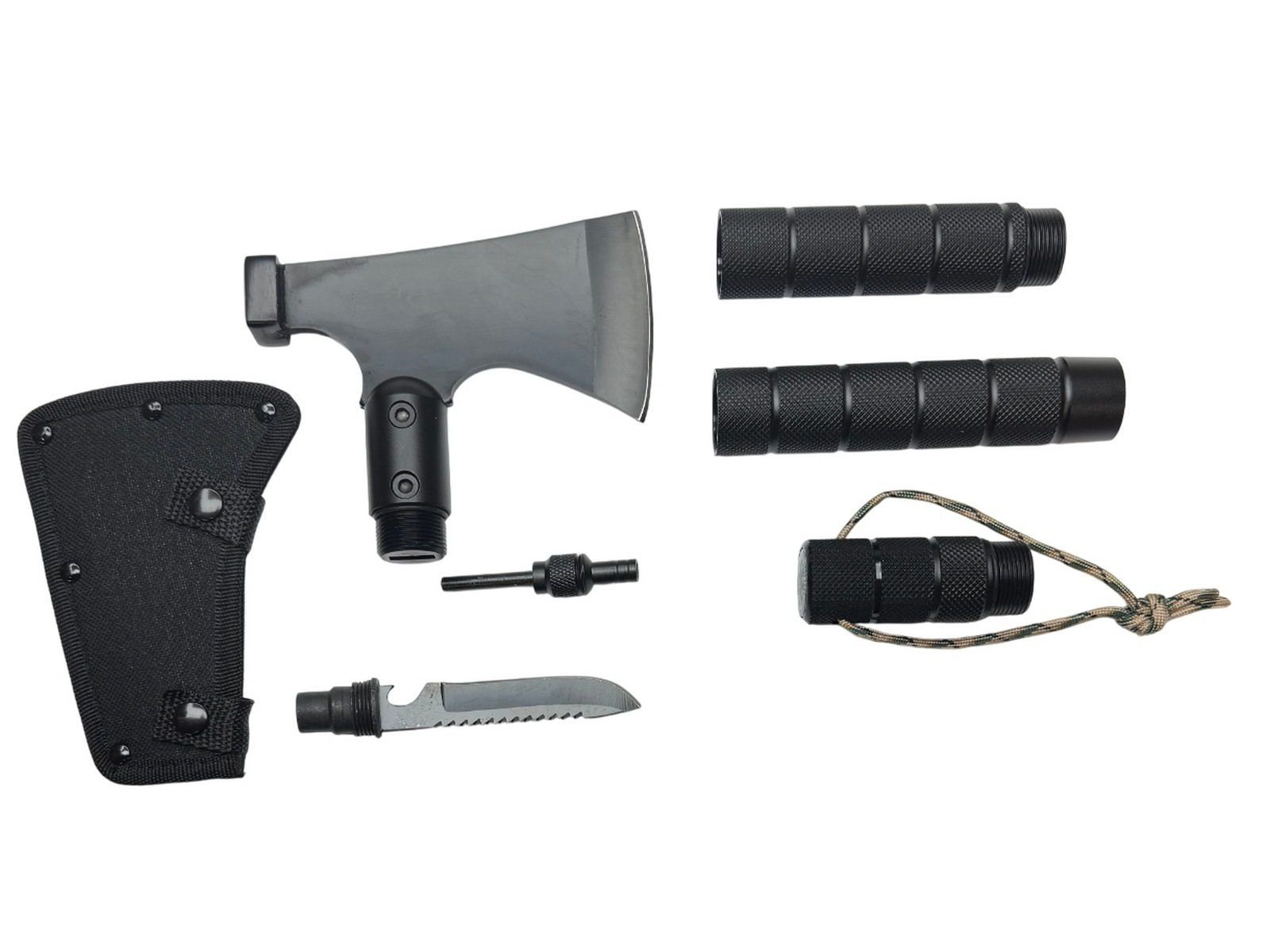 Топор окрашен в черный однотонный цвет. Поставляется в комплекте с тканевым чехлом. Имеет расширенный опционал за счет дополнительных инструментов: