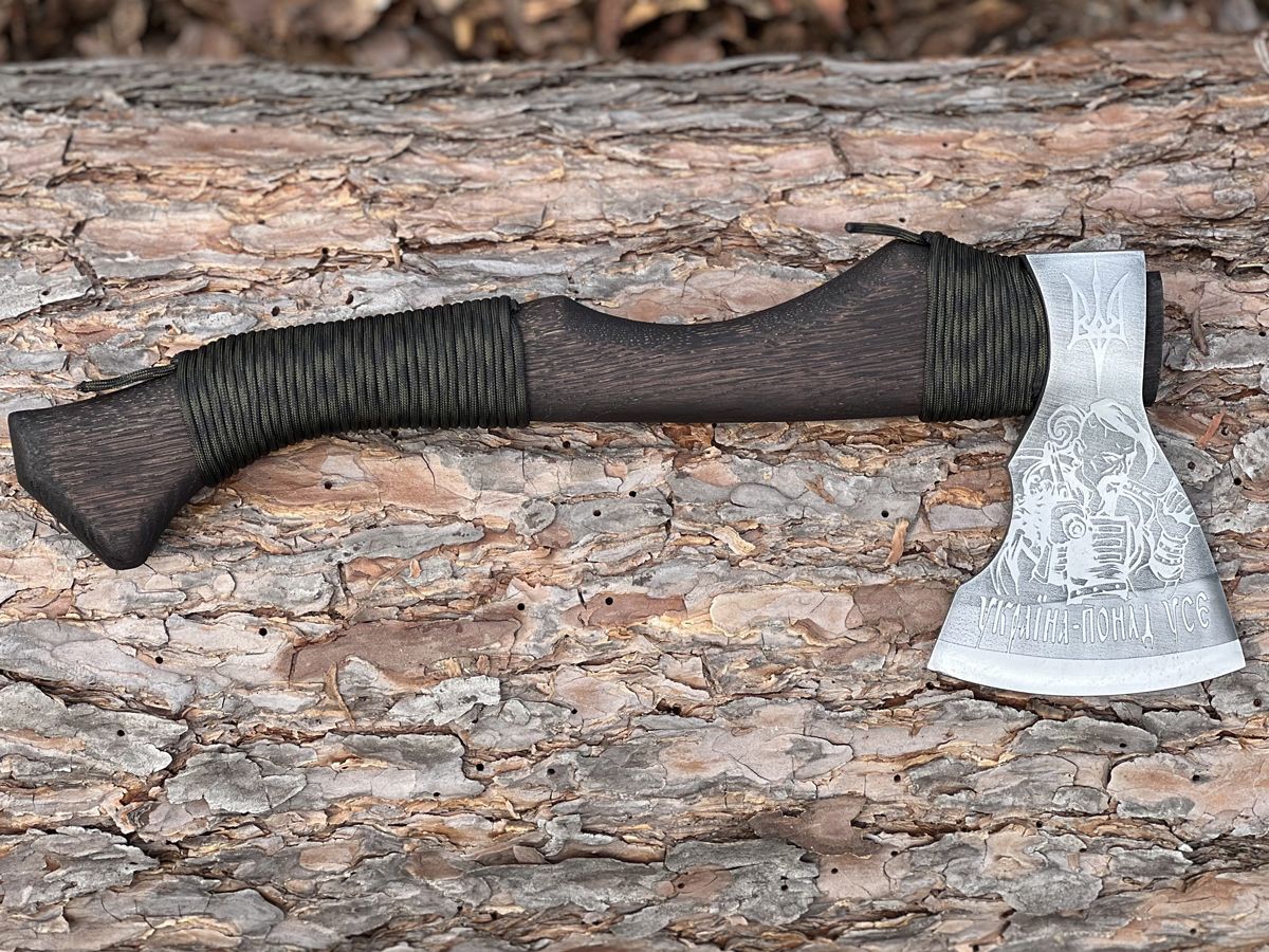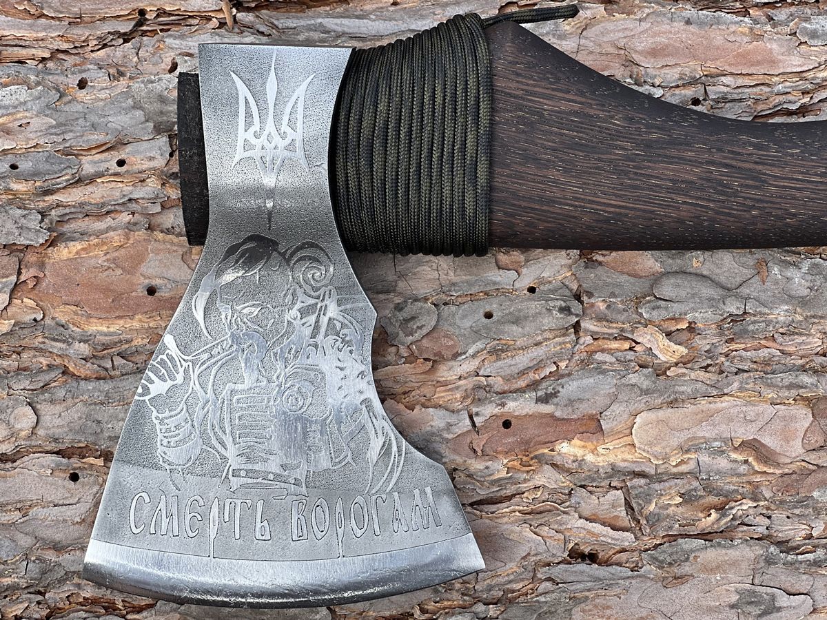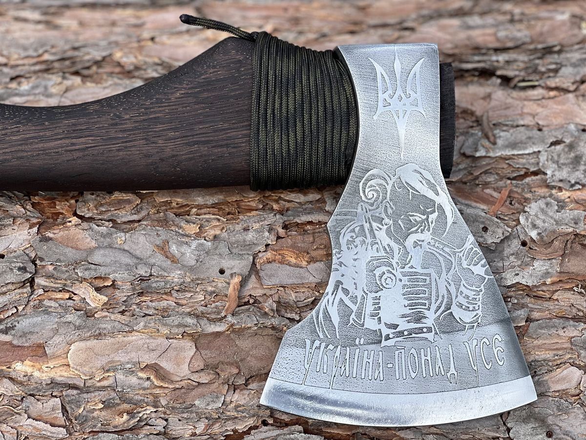 Голова топора украшена национальной украинской символикой. Хорошо закалена рабочая часть лезвия. Долго держит заточку. Топорище крепиться с помощью деревянных клиньев, очень надежно.