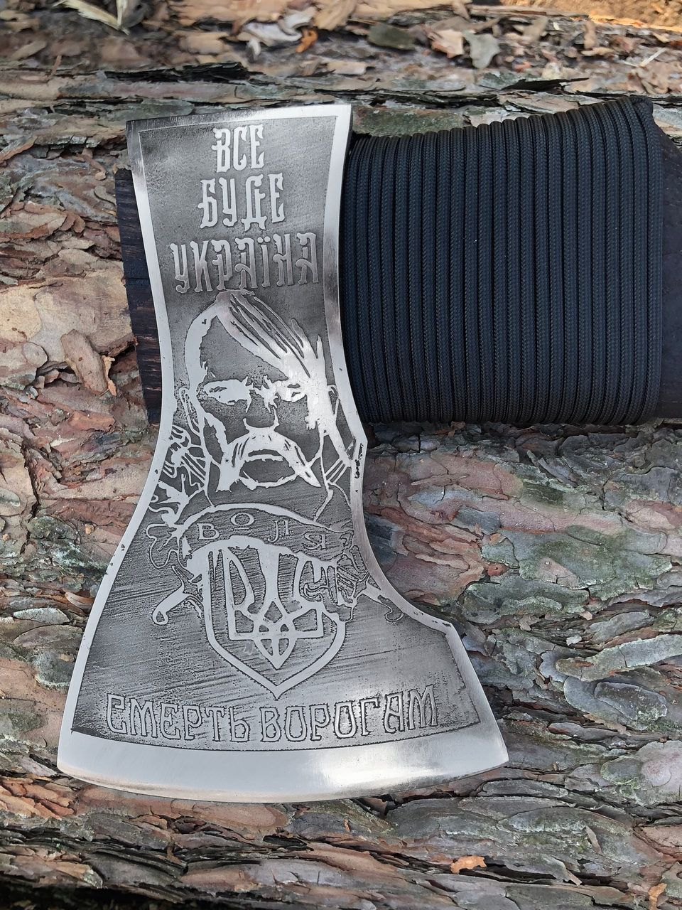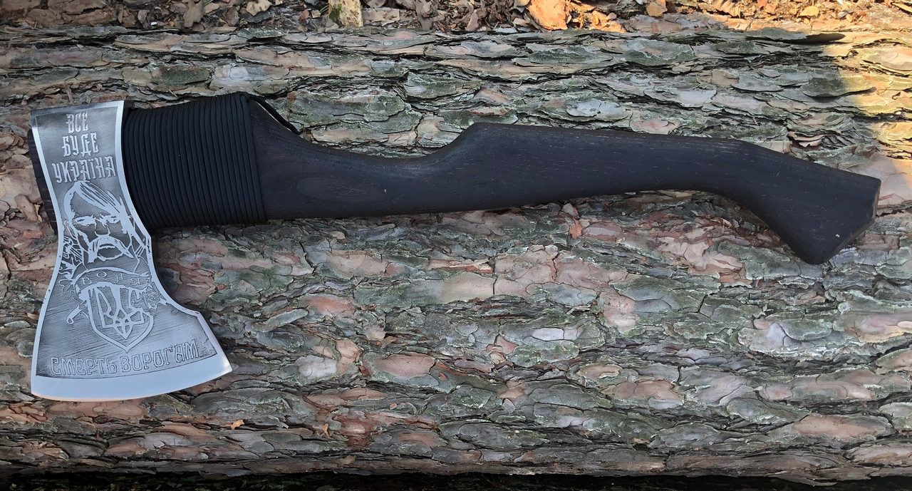 Голова топора украшена украинской патриотической символикой. Хорошо закалена рабочая часть лезвия. Долго держит заточку. Топорище крепиться с помощью деревянных клиньев, очень надежно.