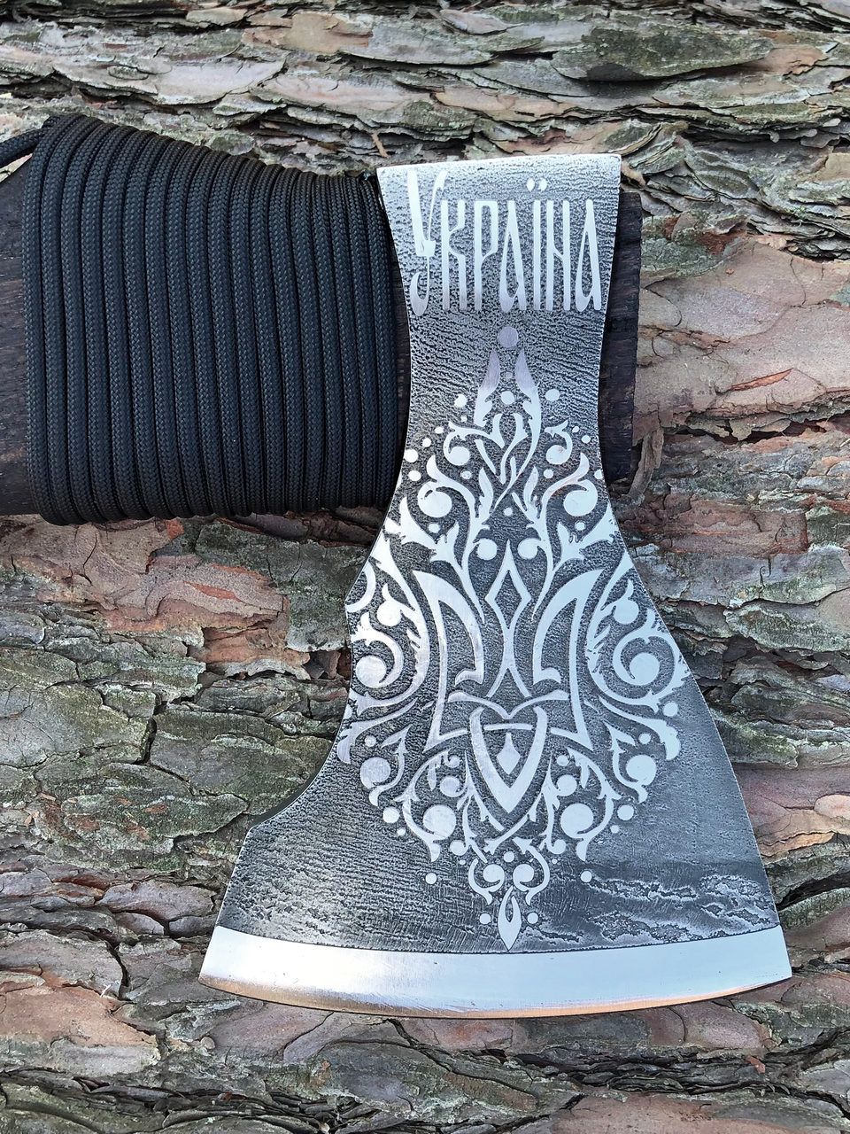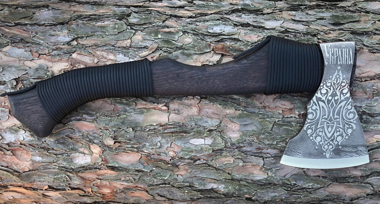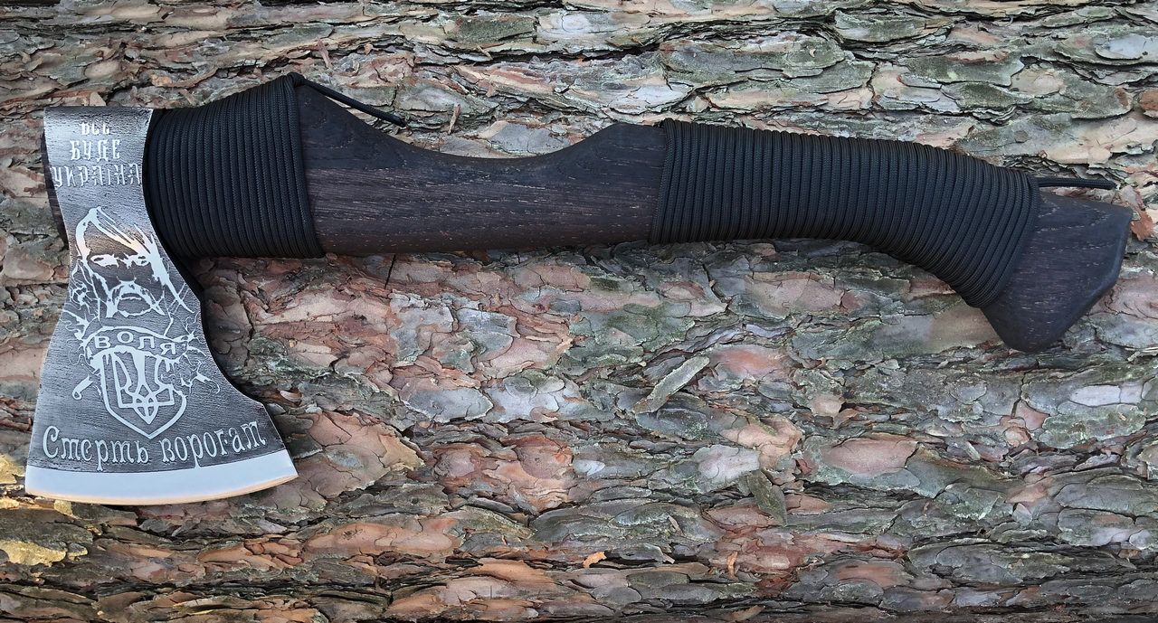Голова топора украшена украинской патриотической символикой. Хорошо закалена рабочая часть лезвия. Долго держит заточку. Топорище крепиться с помощью деревянных клиньев, очень надежно.