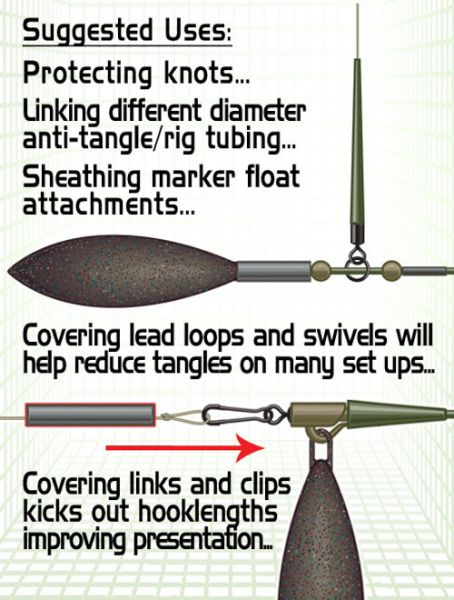 Трубочки используются для прикрывания вертлюжков, разных застежек грузил и поводков. Не позволяют путаться оснасткам, предохраняют узлы от повреждений. Материал средней прочности обеспечивает оптимальный баланс между твердостью и гибкостью трубочки.