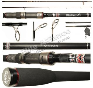 Для того чтобы производить максимально дальние забросы, удочка оборудована широкими пропускными кольцами, первое из которых имеет диаметр пятьдесят миллиметров. Комплектуется винтовым катушкодержателем, расположенным на рукояти с неопреновыми вставками.
