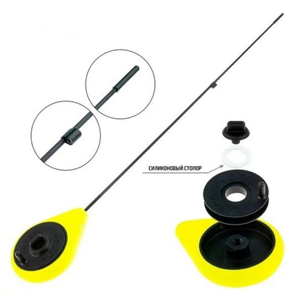Яркая окраска рукояти помогает легко заметить удочку на снегу. Специальная шайба внутри шпули обеспечивает лучшее скольжение лески.