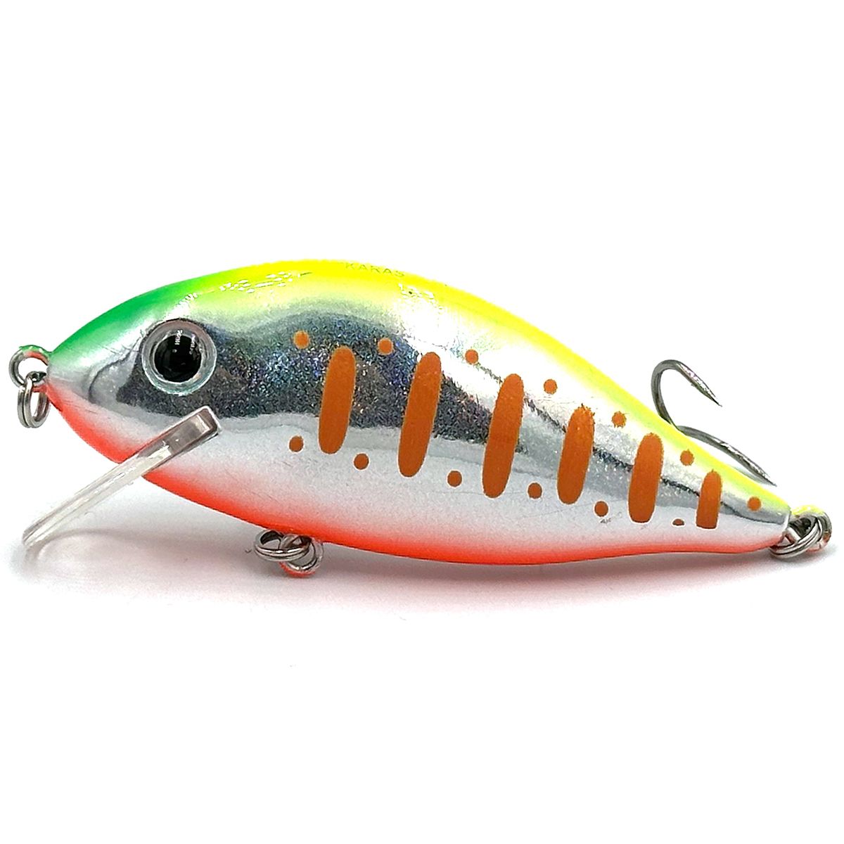 Воблер Gladiator Karas - своей формой напоминает карасика или густеру. Наиболее результативный при использовании на заросших мелководьях с глубинами до 2 метров как с берега, так и с лодки. Также есть возможность использовать при троллинге на глубинах от 2 до 4.5 метров. Имеет активную собственную игру, которая делает его уловистым как на равномерной проводке, так и на проводке с короткими паузами или остановками. Оснащен шумовой камерой для большего привлечения хищника. Удачно применяется для ловли щуки и окуня.
