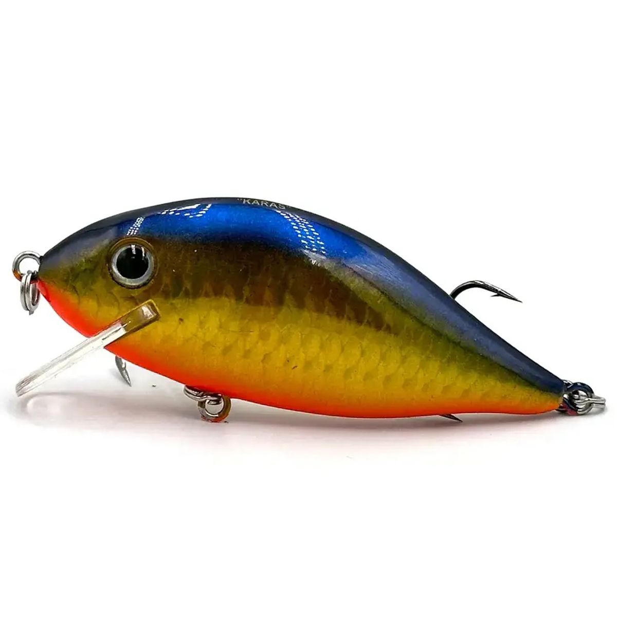 Воблер Gladiator Karas - своей формой напоминает карасика или густеру. Наиболее результативный при использовании на заросших мелководьях с глубинами до 2 метров как с берега, так и с лодки. Также есть возможность использовать при троллинге на глубинах от 2 до 4.5 метров. Имеет активную собственную игру, которая делает его уловистым как на равномерной проводке, так и на проводке с короткими паузами или остановками. Оснащен шумовой камерой для большего привлечения хищника. Удачно применяется для ловли щуки и окуня.