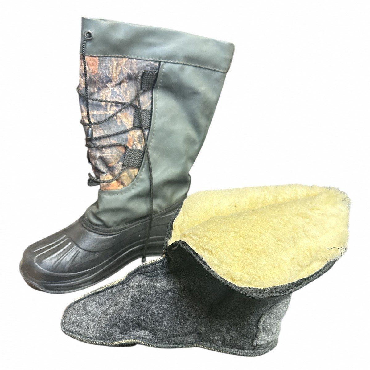 Верх чобіт виготовлений зі щільного зносостійкого ПВХ матеріалу з камуфляжною вставкою, що підвищує практичність та маскування на природі. Манжета оснащена шнурівкою з фіксаторами, що дозволяє щільно затягнути халяву та захистити ногу від попадання снігу, води та холодного повітря.