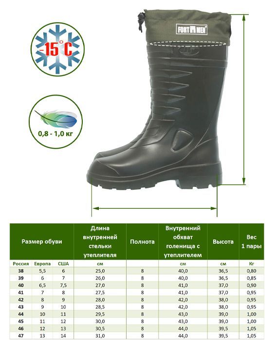 Чоботи виготовлені в Республіці Білорусь. Дуже легкі – середня вага пари всього близько 900 грамів. Забезпечені манжетою з водовідштовхувальної тканини з зав'язками, що тягнуться, проти попадання всередину чобіт дрібного сміття і вологи і укомплектовані вставним м'яким утеплювачем з ворсового нетканого матеріалу, дубльованого фольгованою мембраною.