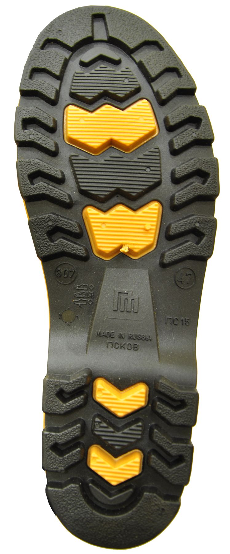 Модель високих чоловічих чобіт виконана методом трикомпонентного лиття - із застосуванням третього додаткового проміжного шару підошви зі спіненого ПВХ, що надає взуттю високі амортизуючі, теплозахисні та антистатичні властивості.