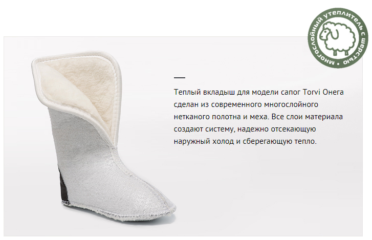 Завдяки новітнім технологіям та сучасним матеріалам Torvi Onega зберігають більшу кількість тепла, ніж звичайні чоботи, при цьому захищають ноги від промокання. Це взуття ідеальне для будь-якого часу, при цьому воно буде доречне як в місті, так і на природі. Нетривіальний дизайн підходить активним людям обох статей.