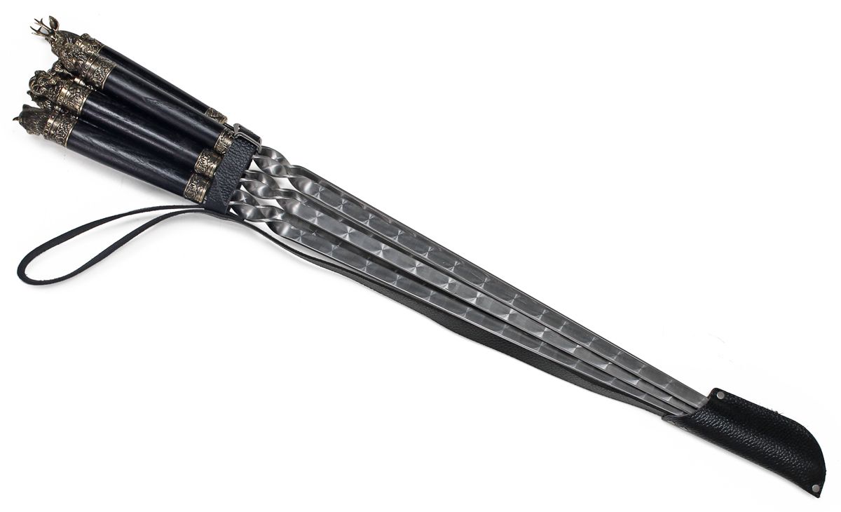 Такі шампура в чохлі відмінно підійдуть як на подарунок, так і для щоденного використання. Ручки шампурів виготовлені з дерева і прикрашені художнім литтям. Голови тварин з якісною деталізацією. Чохол виготовлений з натуральної шкіри. Шкіра не боїться подряпин, легко чиститься, дуже практична у використанні. Прошитий якісної ниткою.