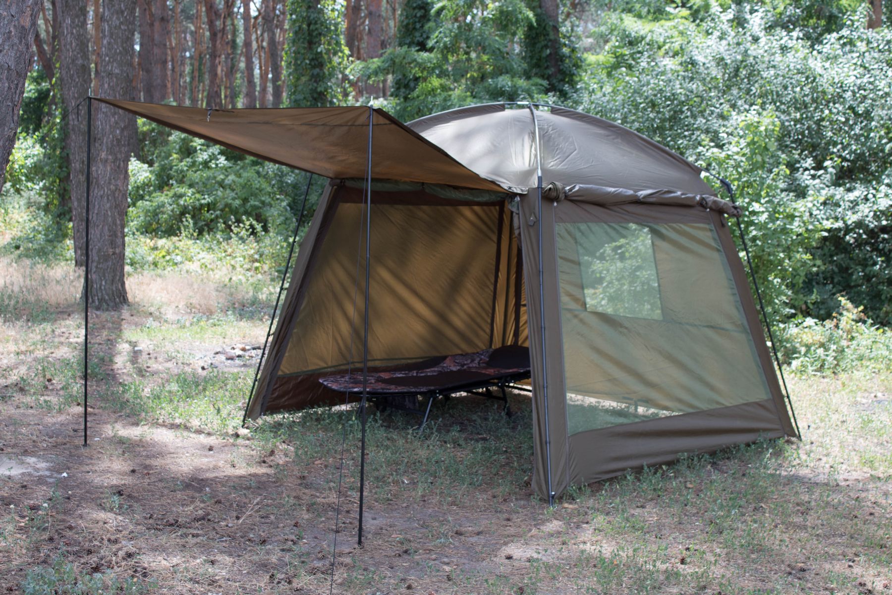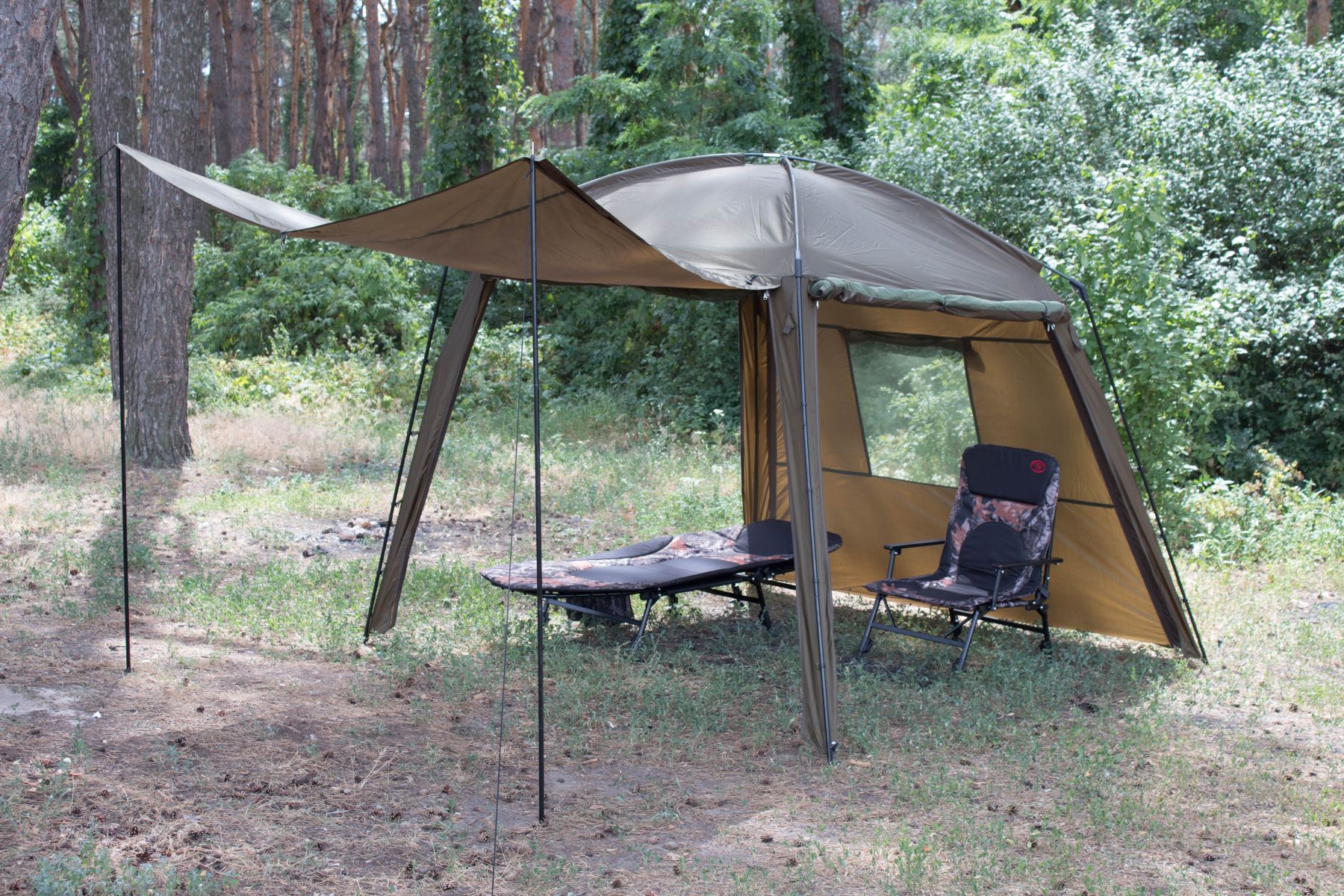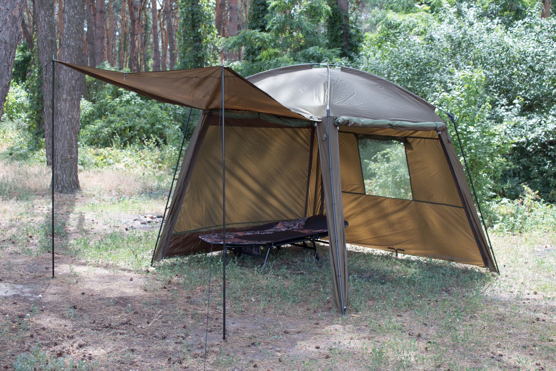 Цей намет обов'язково сподобається рибалкам, які ловлять рибу на березі. Завдяки наявності двох повнорозмірних блискавок з трьох сторін, вікна на задній стінці і можливості створення «ганку», це самий функціональний намет в стилі альтанки.