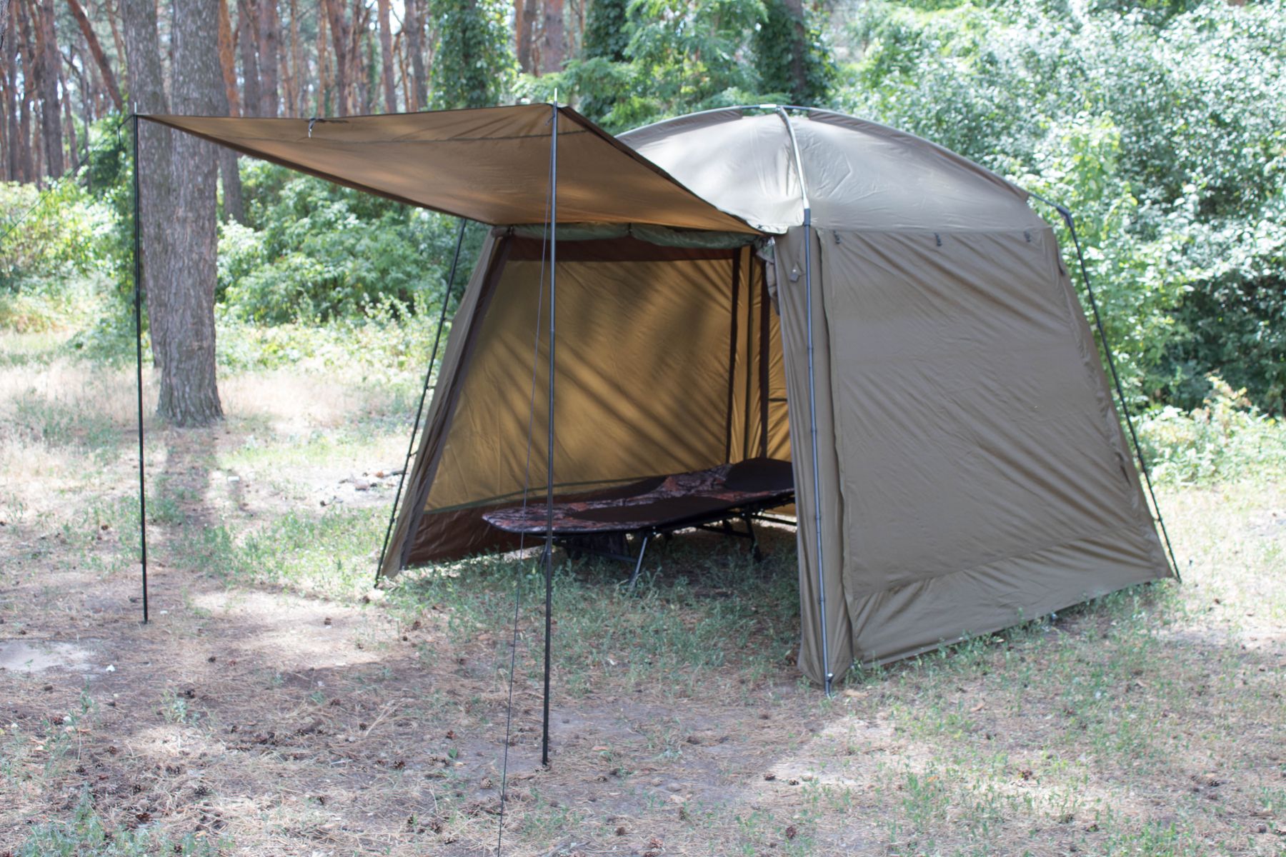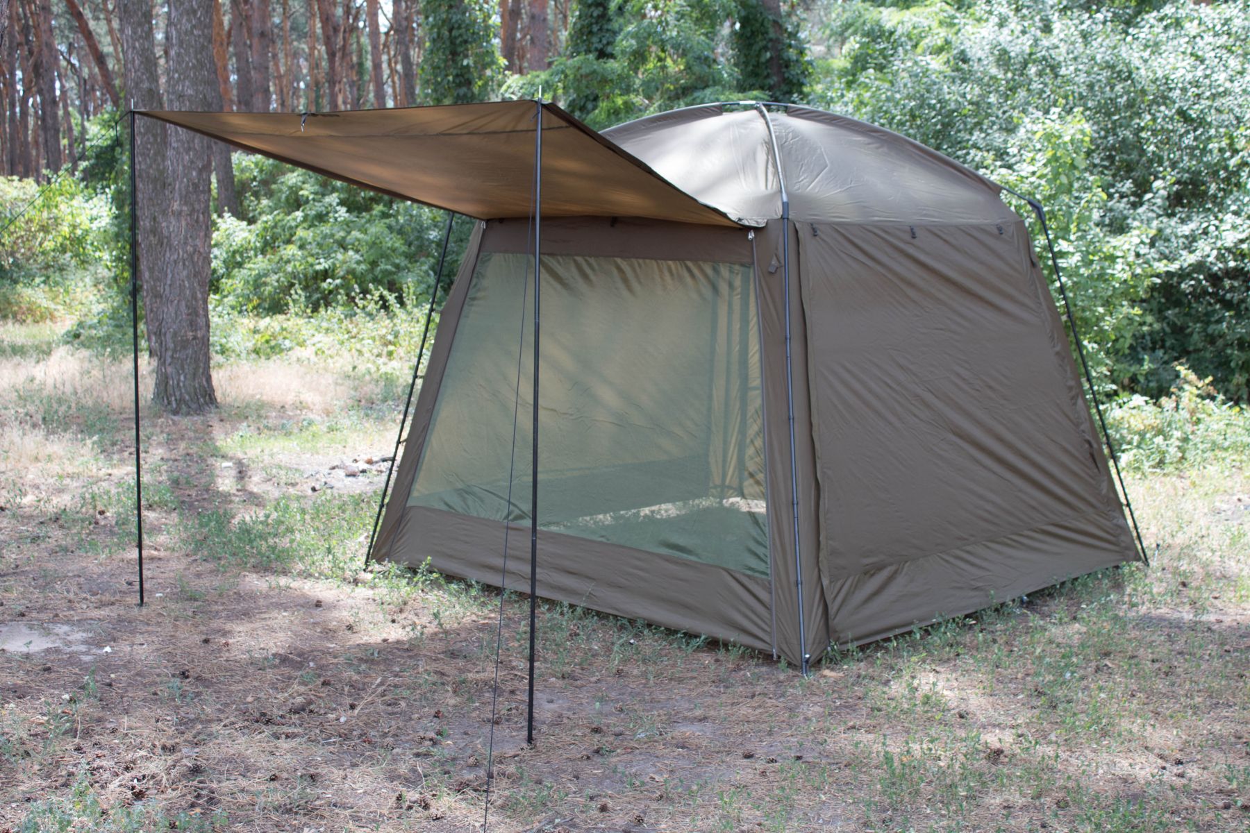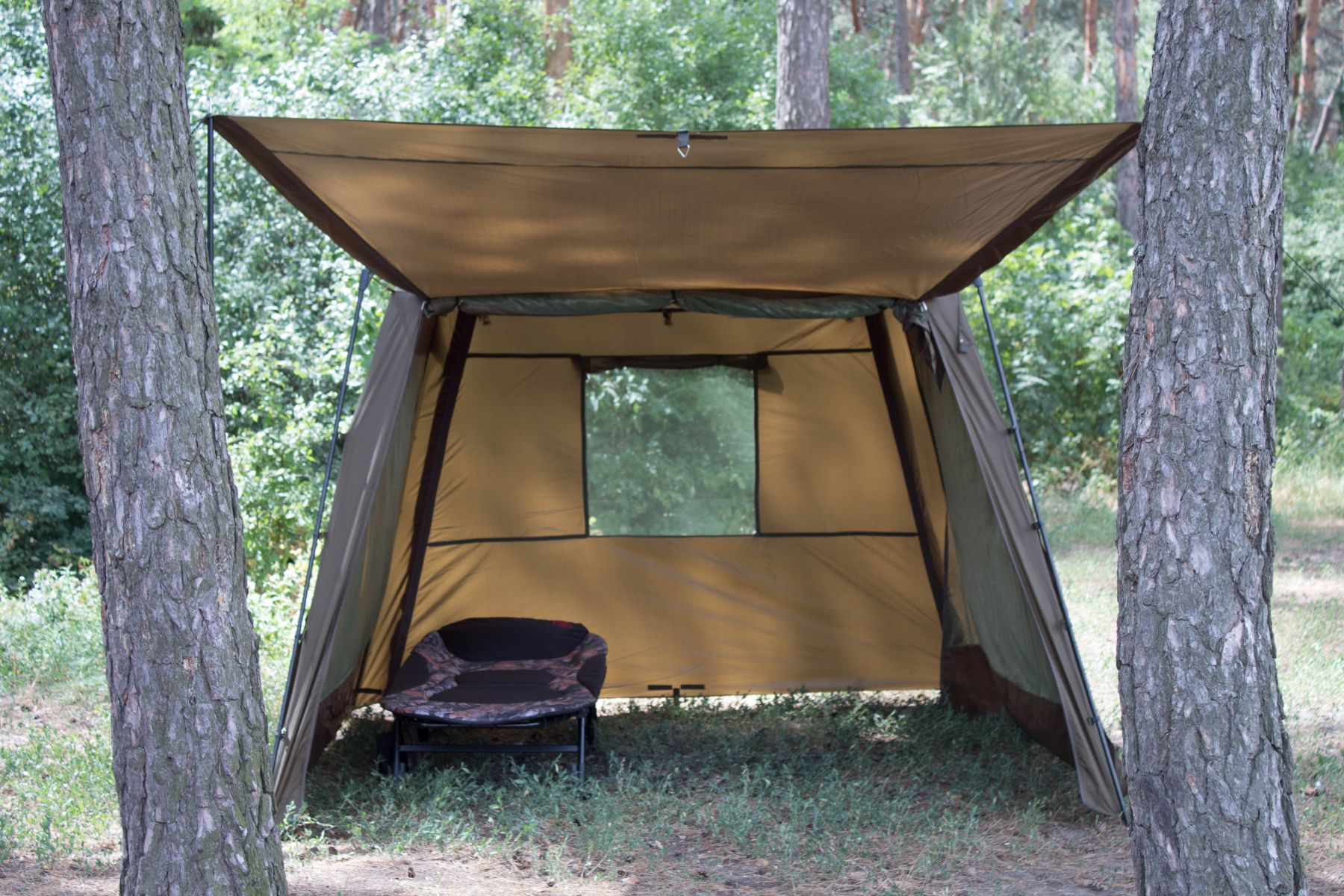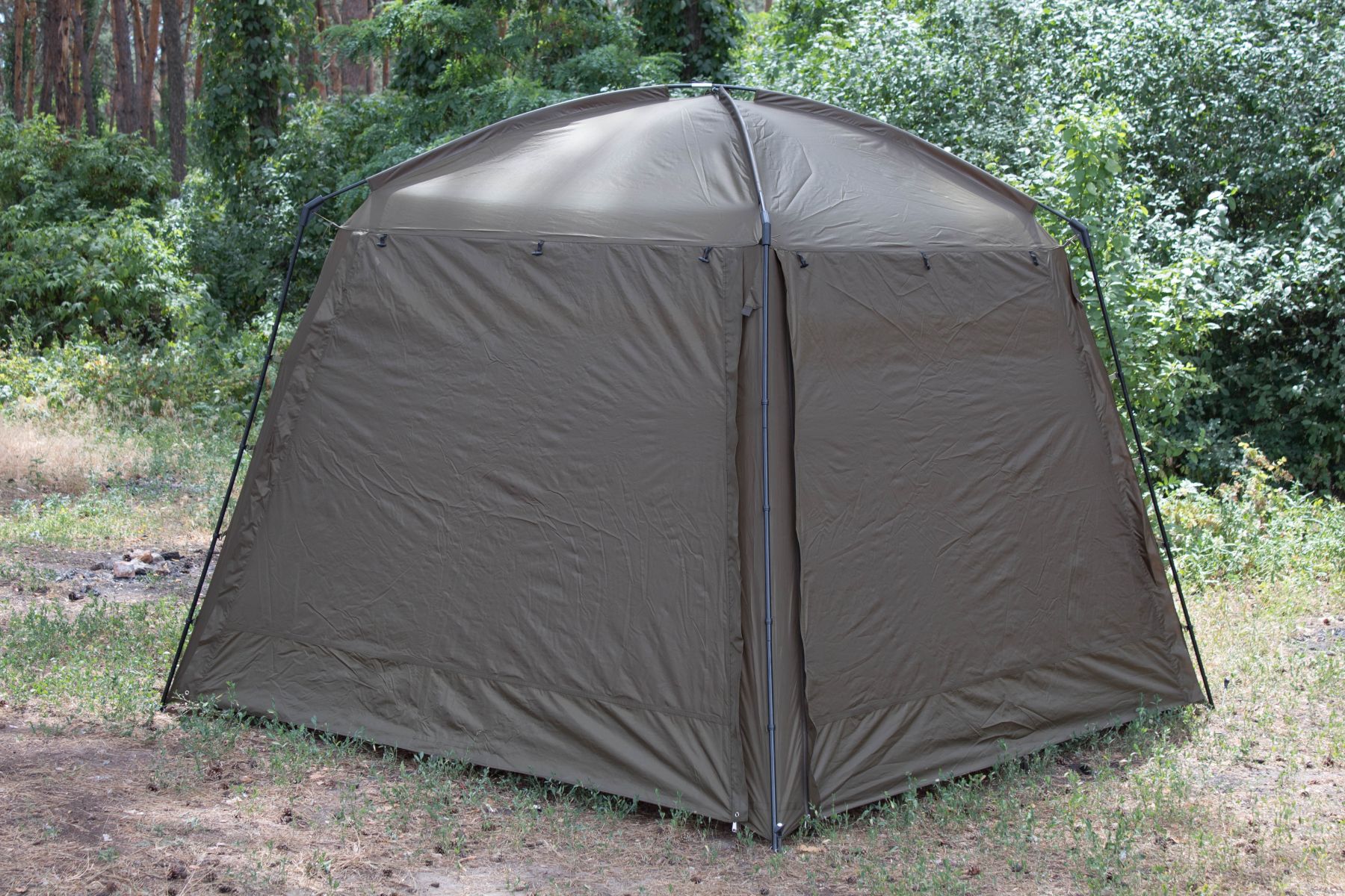 Цей намет обов'язково сподобається рибалкам, які ловлять рибу на березі. Завдяки наявності двох повнорозмірних блискавок з трьох сторін, вікна на задній стінці і можливості створення «ганку», це самий функціональний намет в стилі альтанки.