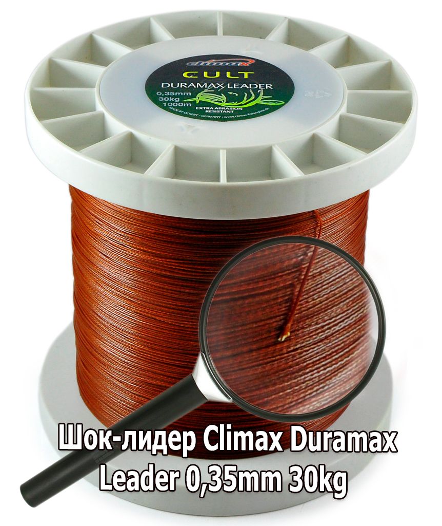 Плетіння Climax CULT Duramax Leader щільний і слизький, мінімальне проникнення вологи всередину - внаслідок цього повідець стійкий до тертя о каміння, корчі та раковини та має тривалий термін експлуатації.