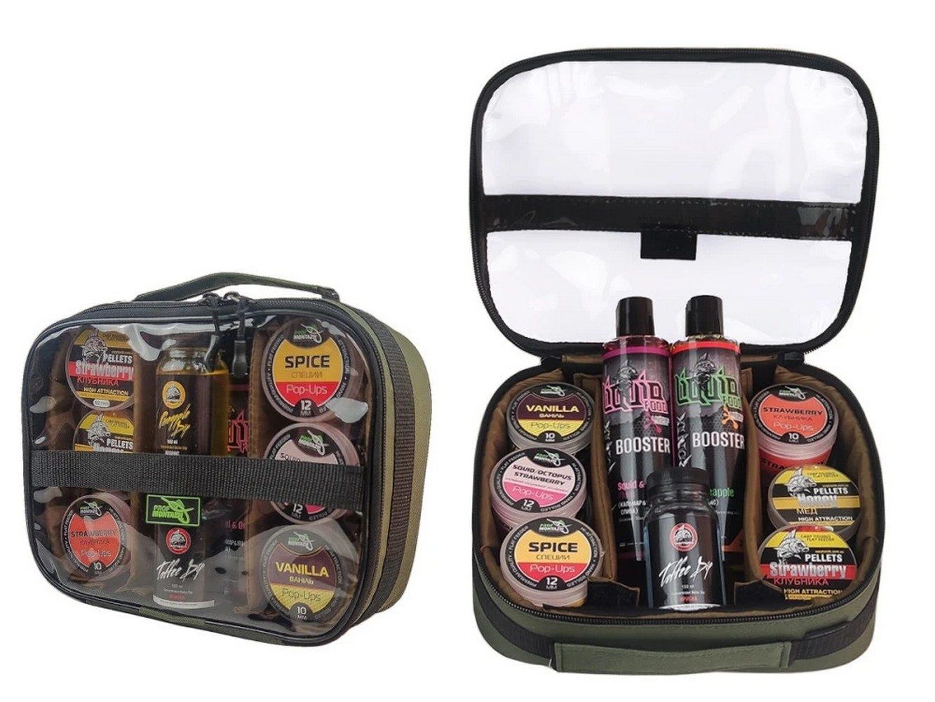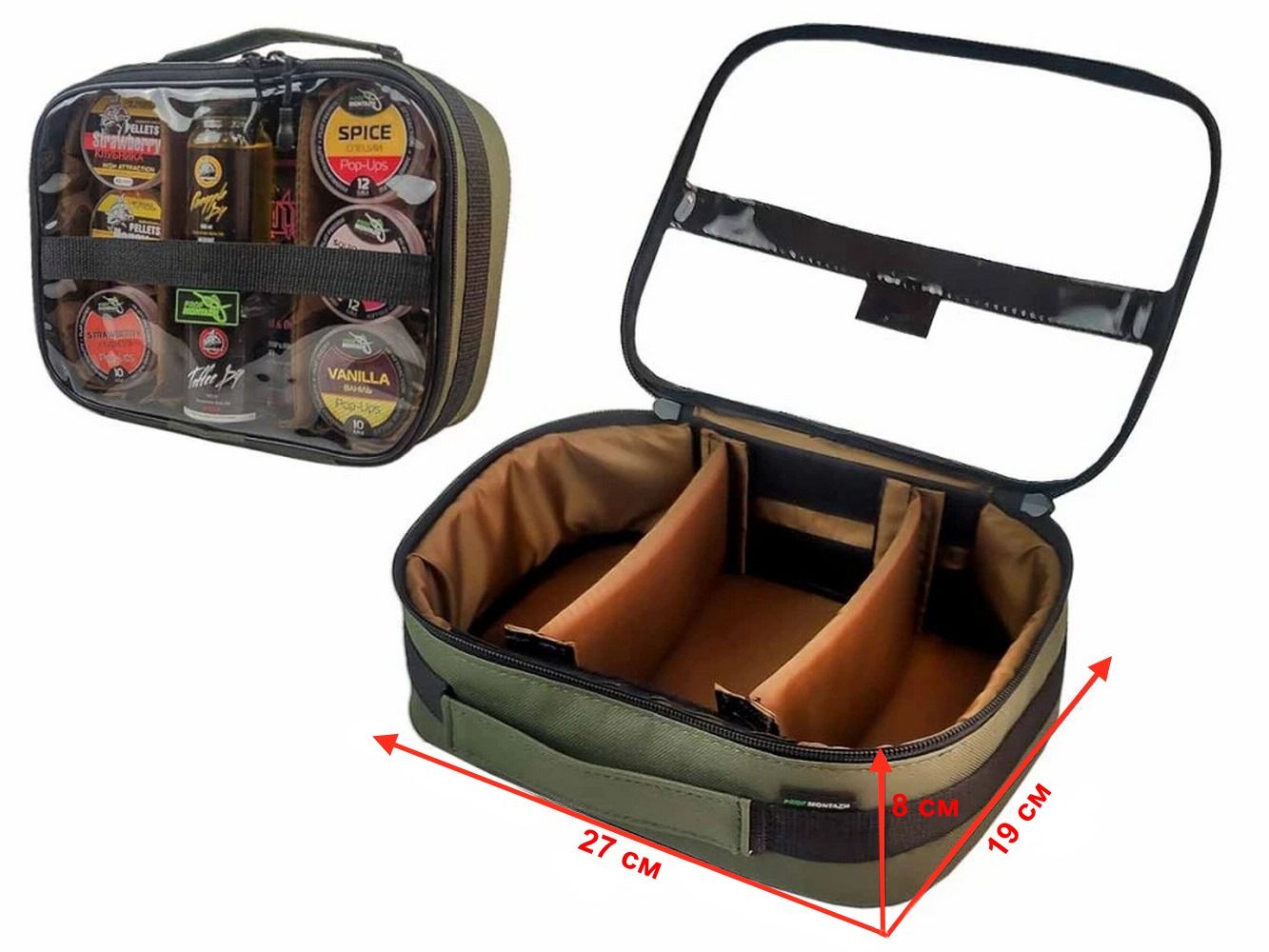 Відмінно підходить для транспортування та зберігання різноманітних аксесуарів, насадок, бойлів, бустерів тощо. для коропового, фідерного або поплавця. Оптимальний розмір під різноманітні баночки з pop-ups, бойлами, ліквідами, дипами і т.п. Внутрішня підкладка та перегородки виконані з матеріалу PPE 7 мм, завдяки чому сумка має підвищену жорсткість та добре захищає вміст від ударів. Прозорий верх дозволяє легко контролювати вміст сумки.