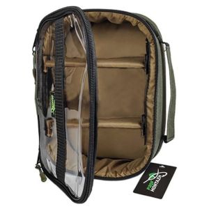 Зручна рибальська сумка з прозорим верхом. Має 2 регульовані перегородки, які утворюють 3 відділення.