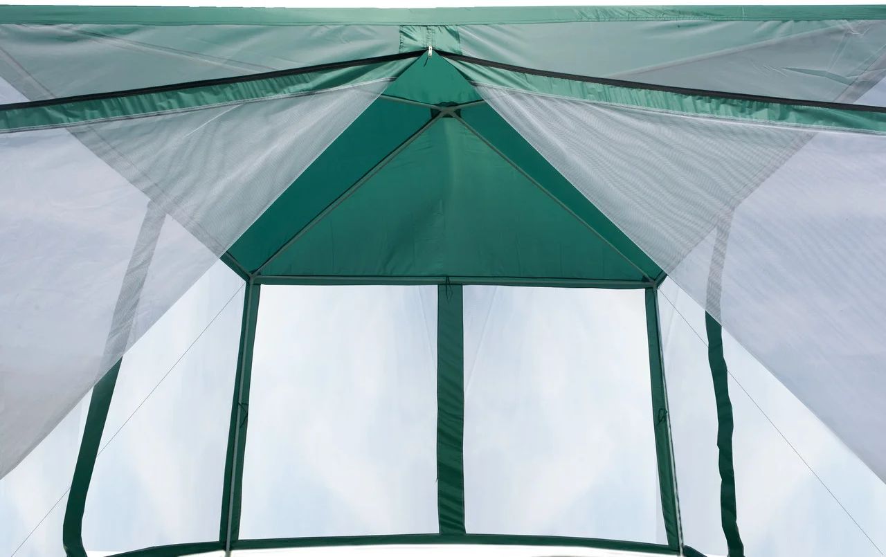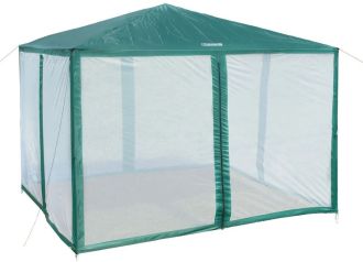 Тент з міцним каркасом і надійними металевими сполучними фітингами. Є можливість додатково закріпити каркас розтяжками. З'ємний водонепроникний тент з проклеєними швами. Бічні стіни з москітної сітки. При необхідності невикористовувані бічні стінки можна закріпити зверху. У комплекті фірмова сумка-чохол, кілочки і розтяжки.