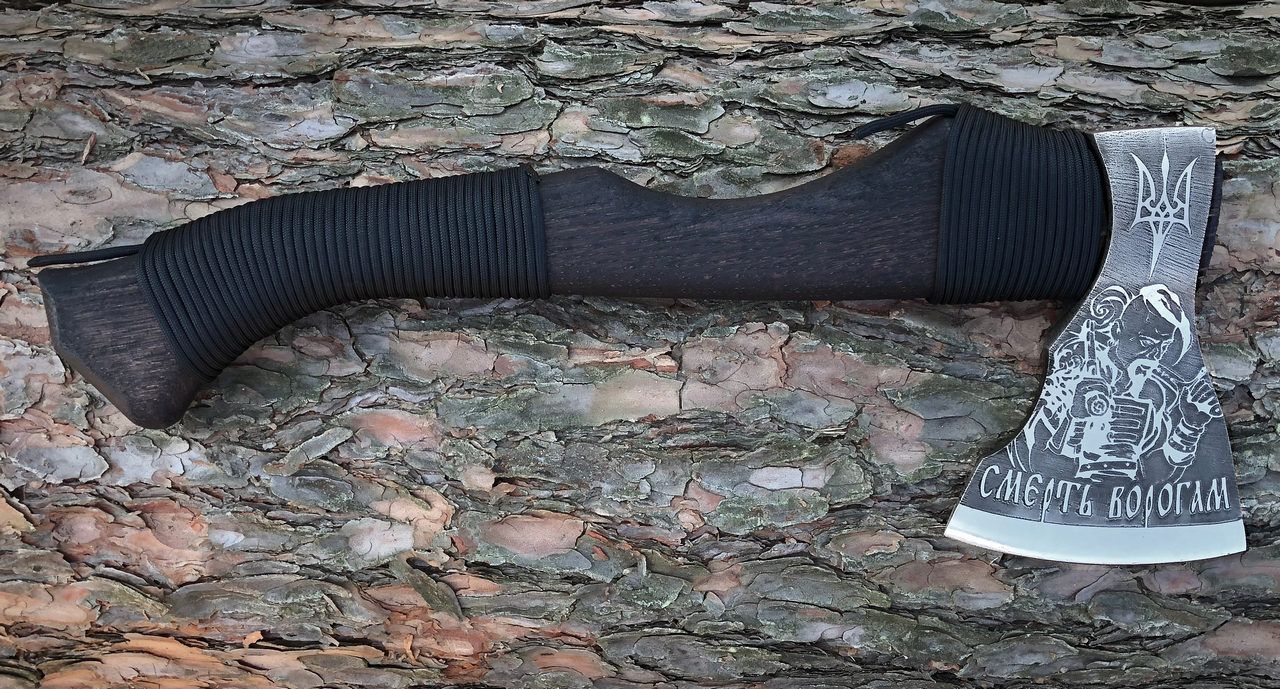 Голову сокири прикрашено українською патріотичною символікою. Добре загартована робоча частина леза. Довго тримає заточення. Сокирка кріпитися за допомогою дерев'яних клинів, дуже надійно.