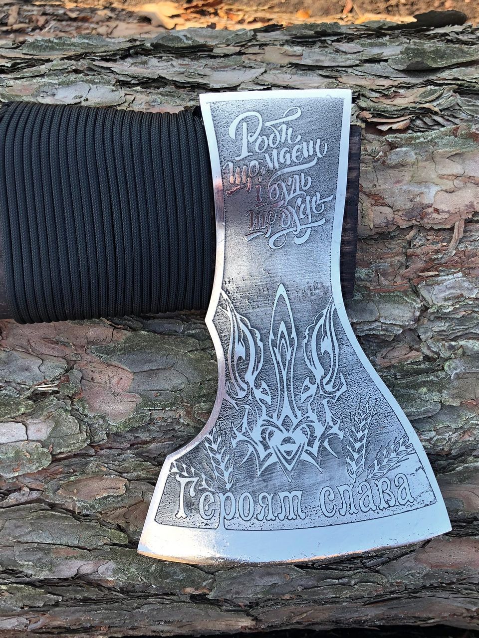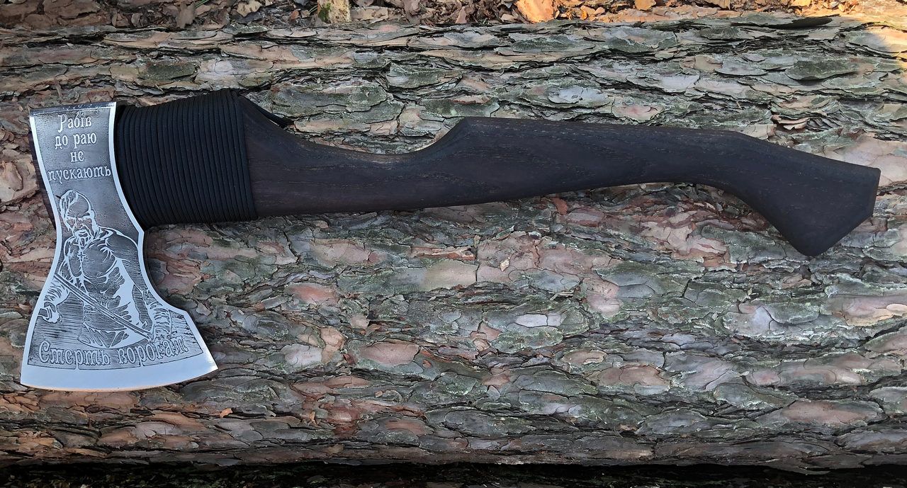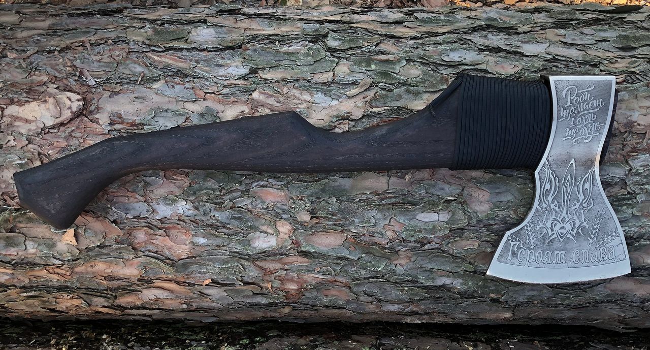 Голову сокири прикрашено українською патріотичною символікою. Добре загартована робоча частина леза. Довго тримає заточення. Сокирка кріпитися за допомогою дерев'яних клинів, дуже надійно.