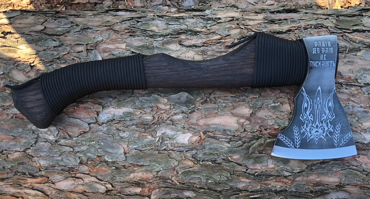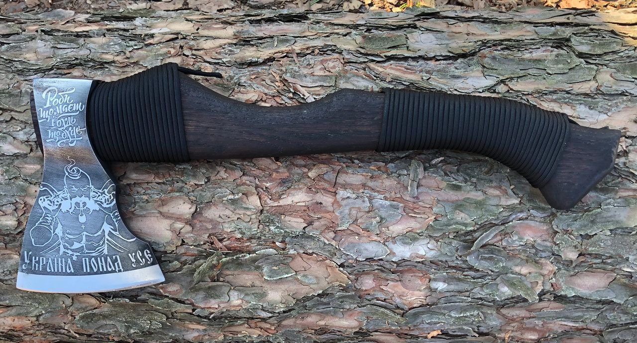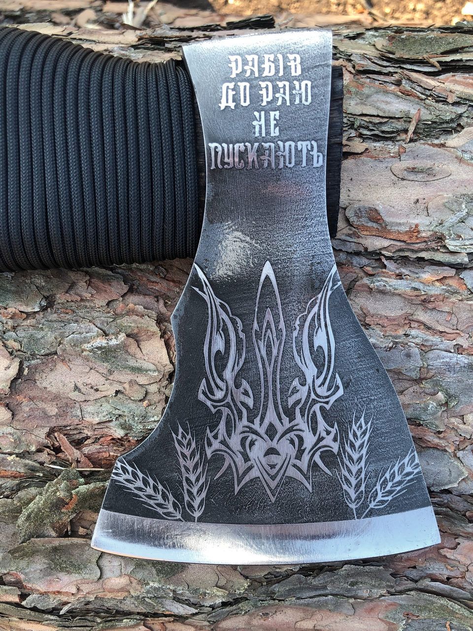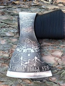 Голову сокири прикрашено українською патріотичною символікою. Добре загартована робоча частина леза. Довго тримає заточення. Сокирка кріпитися за допомогою дерев'яних клинів, дуже надійно.
