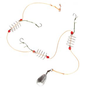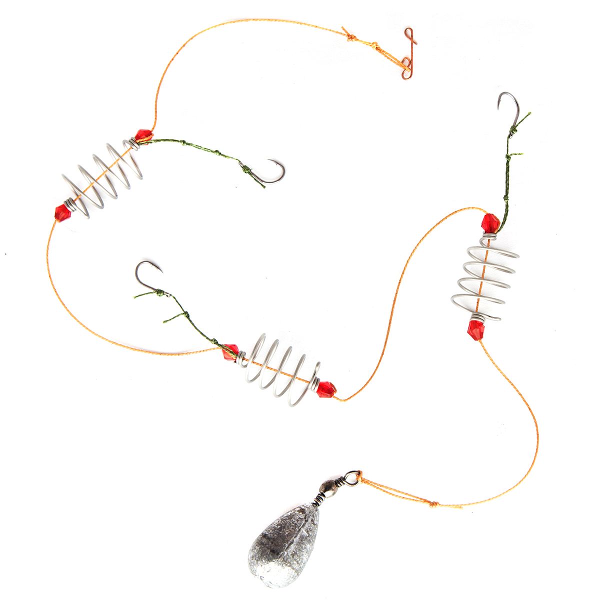 Цей знайомий кожному рибалці-доночнику монтаж містить три годівниці-пружини і таку ж кількість коротких повідців, а також вантажило, щоб конструкцію не зносило течією.