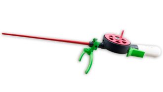 Вудка дуже легка, так як зроблена з пластику та пінопласту. Вона відмінно підійде для тривалої риболовлі, навіть за умови, що рибалка не буде випускати її з рук. Оснащена модель компактної вмонтованою інерційною котушкою з курком, що дозволяє оперативно стравлювати лісочку зі шпулі при необхідності. На хлистика не має пропускних кілець, тому буде потрібно додатково встановити кивок, щоб надавати приманки необхідну анімацію і реєструвати клювання. Для того щоб Ви могли відлучитися від снасті в комплект входить спеціальна пластикова підставка.