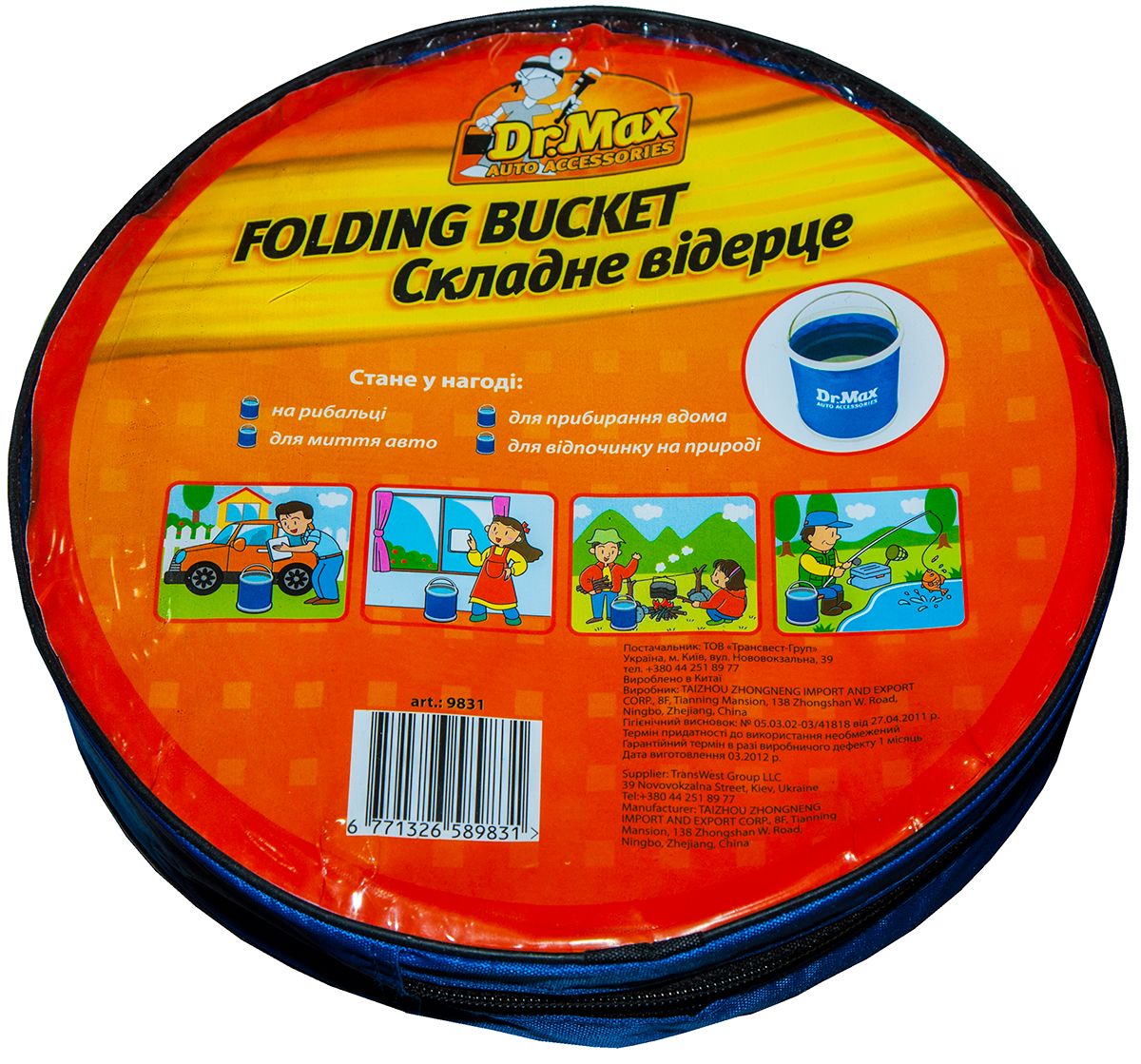 Похідне відро китайського виробництва Dr Max стане незамінним помічником у відпочинку на свіжому повітрі. Предмет наділений здатністю складатися, але при цьому залишається абсолютно непроникним і вміщує в себе 9 літрів рідини. Завдяки своїй функціональності, виріб зручно використовувати при досягненні води з колодязя або джерела, не використовуючи при цьому допоміжні казанки та інший малооб'ємний посуд. Прикріплена міцна рукоятка дозволяє із зручністю переносити великий обсяг води на ту відстань, на яке вам вистачить сил, а також просто зберігати її, підвісивши відро на гачок або поперечину.
