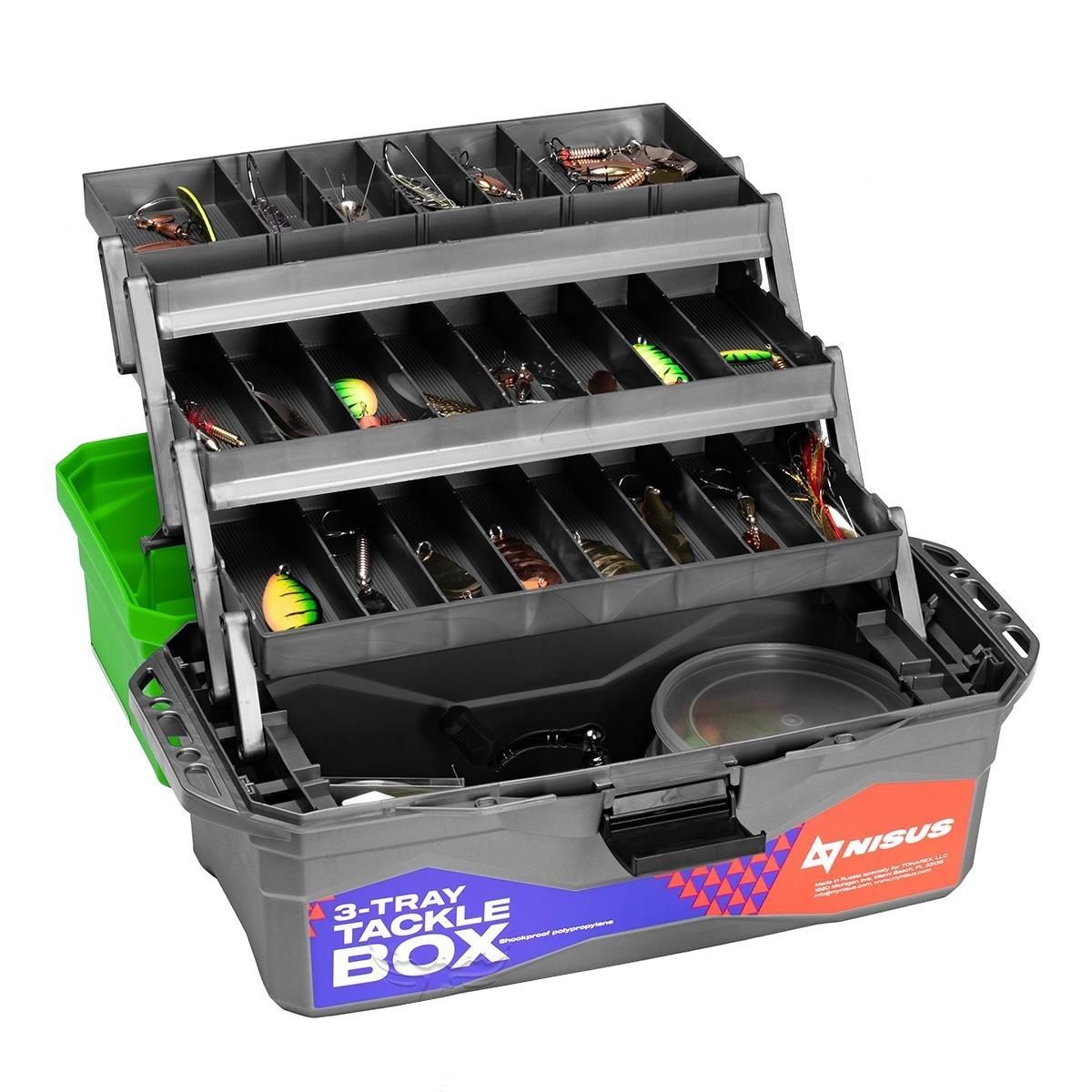 Міцний і надійний ящик для риболовецьких приманок і снастей, який дозволить компактно їх зберігати і переносити. Три висувні полки з відсіками різних розмірів дозволять акуратно розмістити котушки, жилки, приманки, гачки та інше рибальське спорядження. На кришці ящика є відділи, які закриваються прозорою кришкою. Ящик оснащений зручною ручкою для його транспортування.